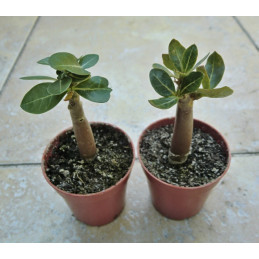 Suchomilný sukulentní keř s velmi ztlustlým kmenem. Oválné, lesklé, kožovité listy na konci výhonů. Jednoduché velké, mléčně bílé květy s růžovým okrajem a žlutým jícnem. Teplomilná rostlina vhodná na tvorbu bonsai. Expedujeme rostliny: Ø květináče 5,5cm, výška 5+cm, Ø kmínku 1+cm.