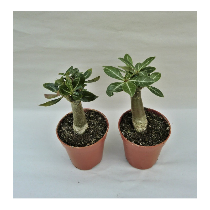 Suchomilný sukulentní keř s velmi ztlustlým kmenem. Oválné, lesklé, kožovité listy na konci výhonů. Jednoduché velké, mléčně bílé květy s růžovým okrajem a žlutým jícnem. Teplomilná rostlina vhodná na tvorbu bonsai. Expedujeme rostliny: Ø květináče 5,5cm, výška 5+cm, Ø kmínku 1+cm.