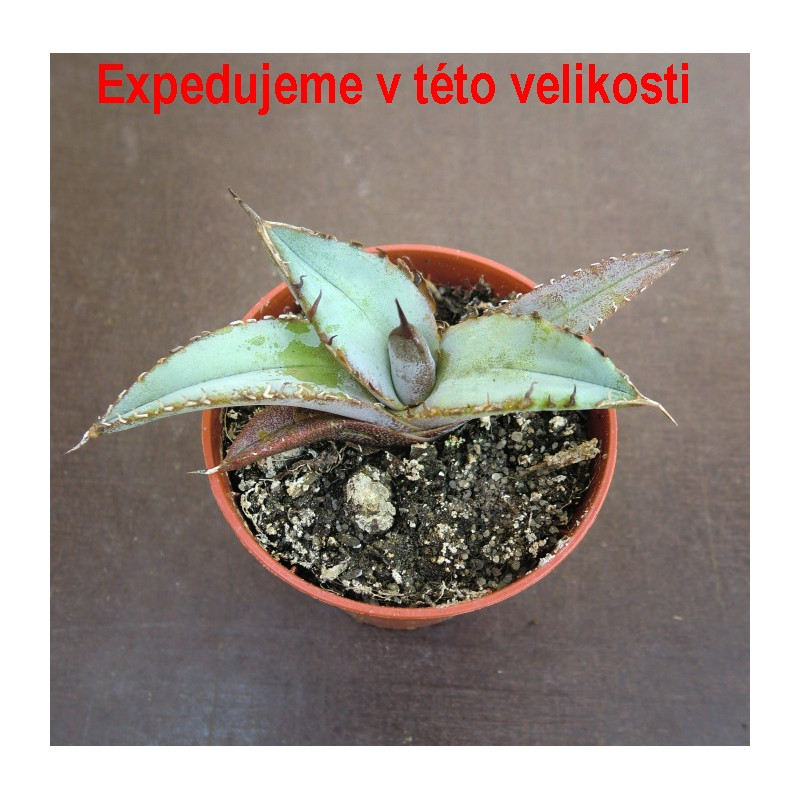 Méně vzrůstná agáve, která vytváří růžici tuhých tmavě zelených listů s bílou kresbou na horní i spodní části. Expedujeme rostliny: Ø květináče 5,5cm.