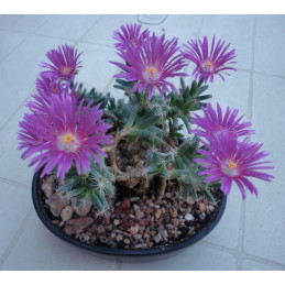 Suchomilná, sukulentní rostlina s dužnatými trojbokými listy, které jsou 2cm dlouhé a zakončeny jemnými štětinkami. Růžovofialové květy o průměru 5cm. Bohatě kvetoucí od poloviny března do konce dubna. Vytváří ztlustlé kořeny a je velmi vhodná na tvorbu bonsai. Roste rychleji a má větší květy než ostatní druhy Trichodiadema. Pochází z Jižního Kapska v JAR. Expedujeme rostliny: Ve formě bonsai, Ø květináče 6,5cm.
