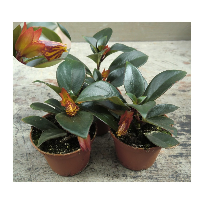 Oválné, kožovité lesklé listy jsou tmavě zelené. Kvete na jaře nebo v létě červeno/žlutými květy s červenými listeny, které na rostlině zůstávají i po odkvětu. Expedujeme rostliny: Ø květináče 6,5cm.
