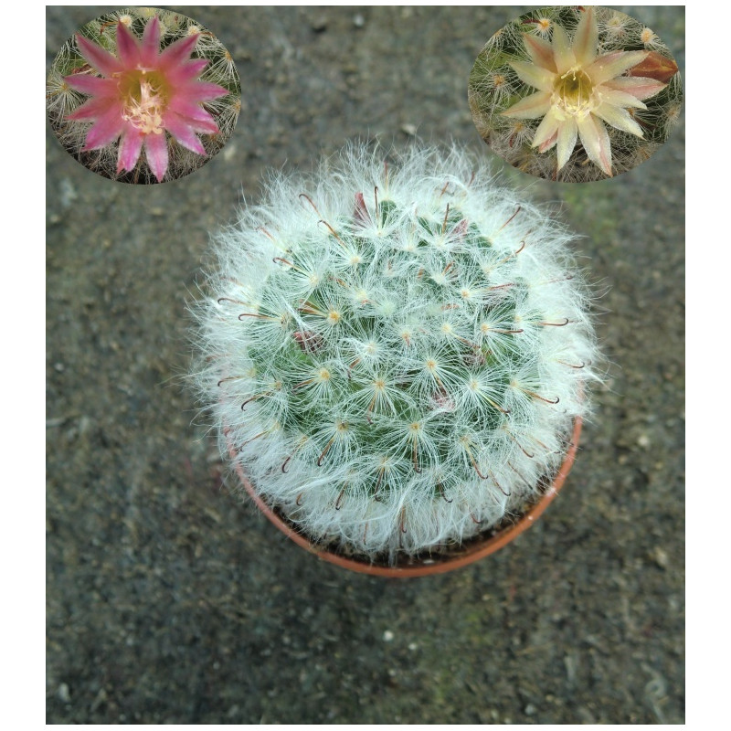 Kaktus pokrytý bílými, měkkými ostny. Vonné zlatožluté květy 2,5cm v průměru. Později vytváří shluky těl. Pochází z Mexika. Expedujeme rostliny: Ø květináče 5,5cm.