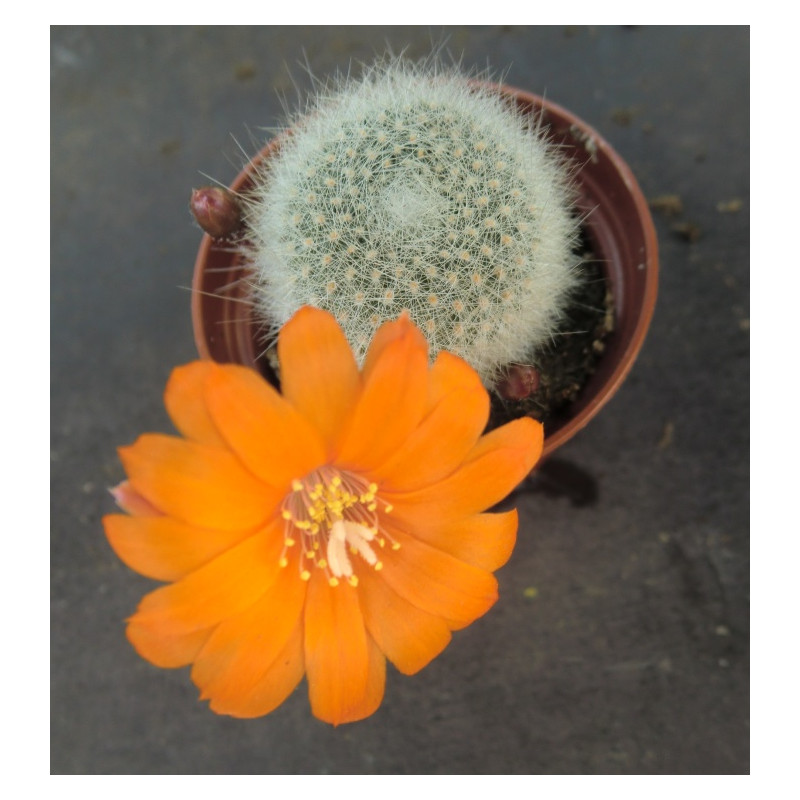 Drobný druh, husté, krátké bílé trny a oranžové květy. Původem z Bolívie. Expedujeme rostliny: Ø květináče 5,5cm.