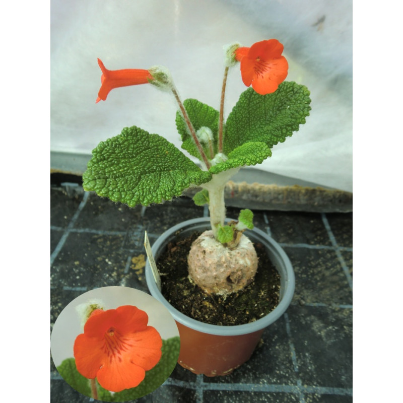 Méně známá suchomilná rostlina se zelenými silně plstnatými listy. Vytváří kulatou hlízu (kaudex). Trubkovité červené květy. Expedujeme rostliny: Ø kaudexu / hlízy 2,5cm.
