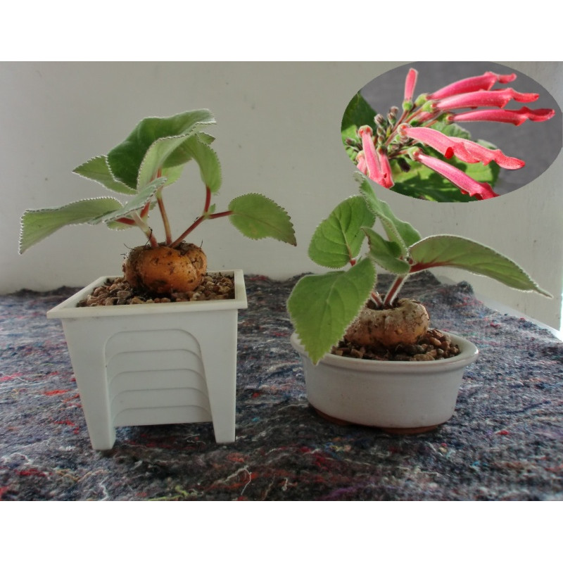 Suchomilná dekorativní rostlina. Vytváří kulatý kaudex, zelené, plstnaté listy a trubkovité růžové květy. Expedujeme rostliny: Ø kaudexu /hlízy 2cm.