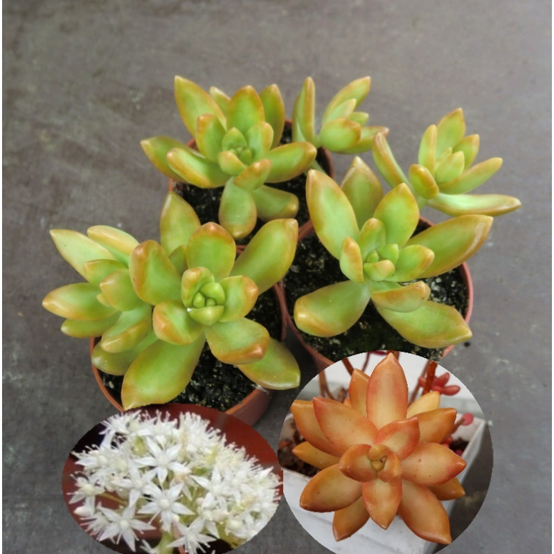 Rozchodník, tvoří žluto-zelené listy v růžici. Při pěstování na sluníčku se zbarvují do oranžova. Hvězdicovité, malé, bílé květy.  Expedujeme rostliny: Ø květináče 5,5cm.