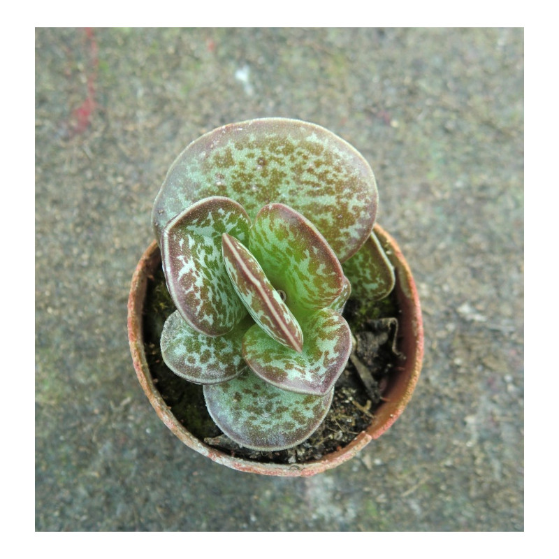 Africký sukulent tvořící trsy přisedlých, jemně ojíněných plochých listů s červenohnědou kresbou na povrchu. Expedujeme rostliny: Ø květináče 5,5cm.