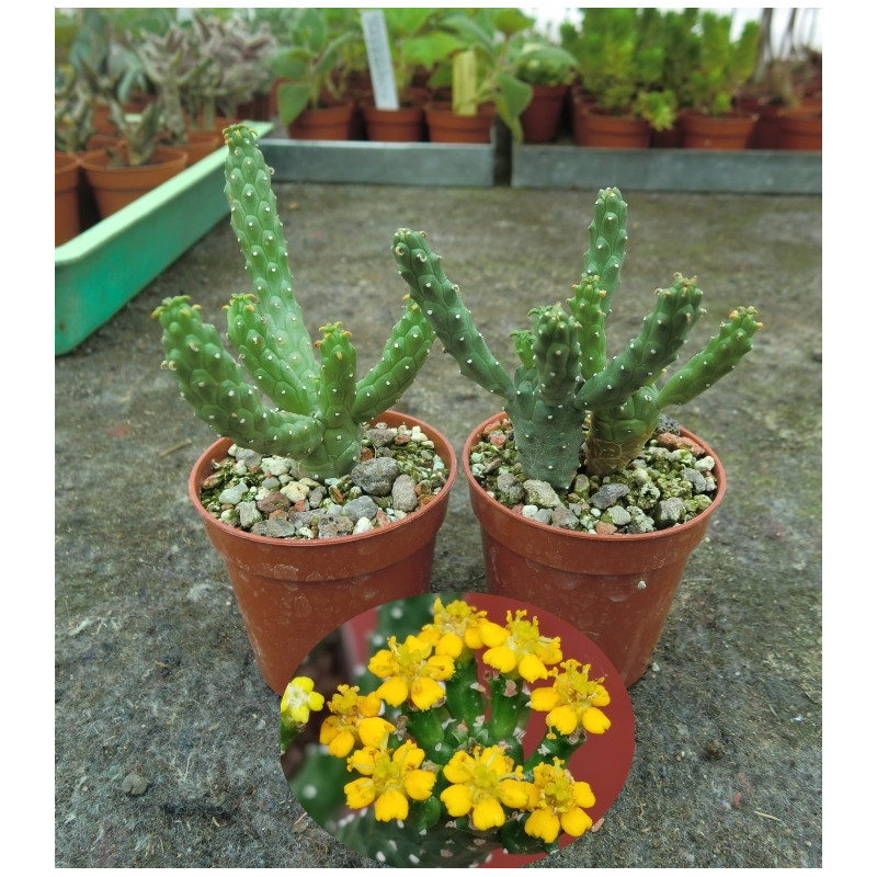 Tento sukulent vytváří mnoho postraních větví z hlavního stonku, které jsou na konci zúžené a připomínají hlavu Medúzy. Žluté květy na vrcholu. Tvoříí kaudex. Expedujeme rostliny: Ø květináče 5,5cm.