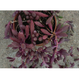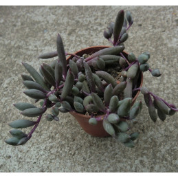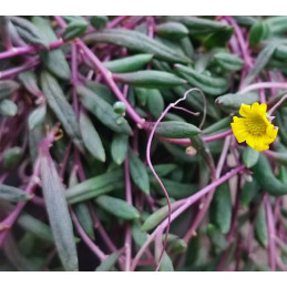 Starček, tvoří převislé výhony se zelenošedými oválnými listy na fialových stoncích. Tato kombinace působí efektně. Malé žluté květy. Pochází z Afriky. Expedujeme rostliny: Ø květináče 5,5cm.