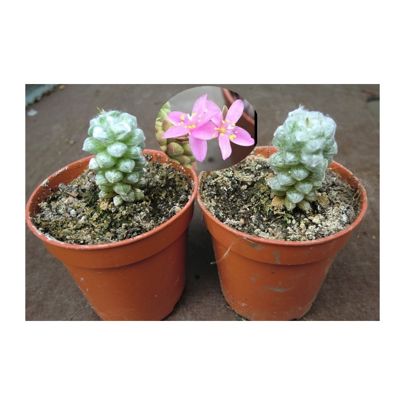 Nízký Rozchodník s vejčitými , tmavě zelenými listy, které jsou pokryté bělavými šupinami. Růžovobílé hvězdicovité květy. Vhodný na tvorbu bonsai.  Expedujeme rostliny: Ø květináče 5,5cm, výška rostliny 6+cm, květuschopné.