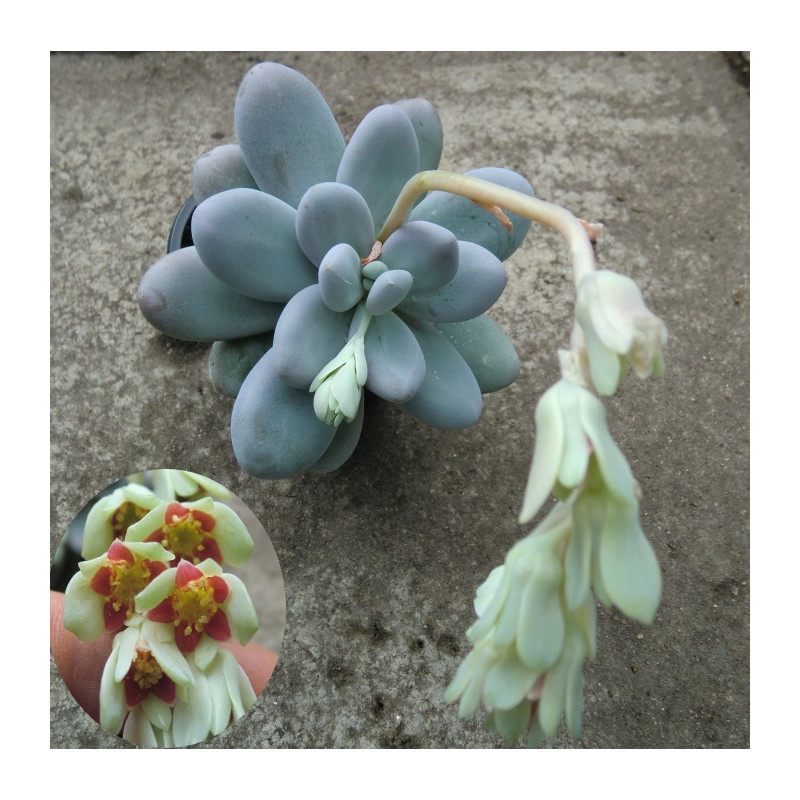 Nenáročná sukulentní rostlina. Šedě ojíněné, velmi tučné listy v růžici získávají fialový nádech na slunci. Zvonečkové, zelenobílé květy jsou uvnitř červené. Pochází z Mexika. Expedujeme rostliny: Ø květináče 6,5cm.
