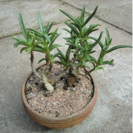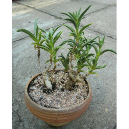 Suchomilný sukulentní keř s velmi ztlustlým kmenem. Oválné, lesklé, kožovité listy na konci výhonů. Jednoduché velké, mléčně bílé květy s růžovým okrajem a žlutým jícnem. Teplomilná rostlina vhodná na tvorbu bonsai. Expedujeme rostliny: Ø květináče 5,5cm, výška 5+cm, Ø kmínku 1+cm.