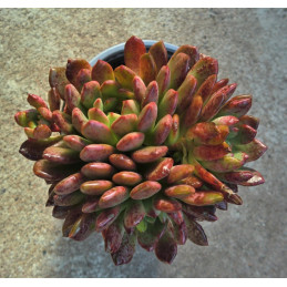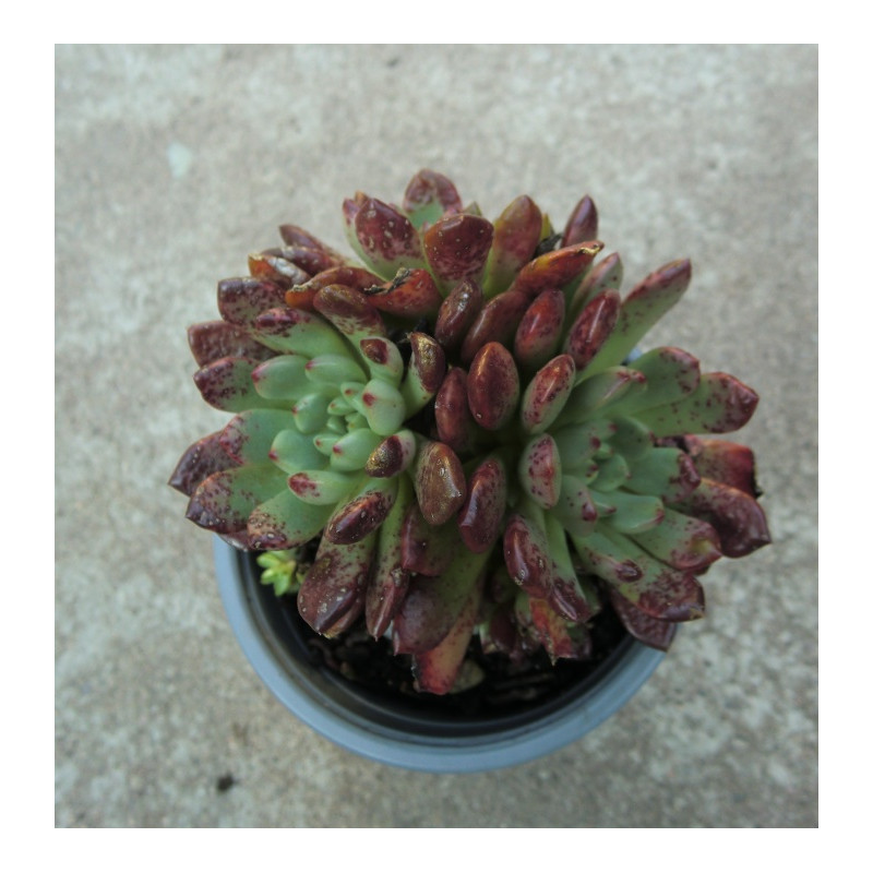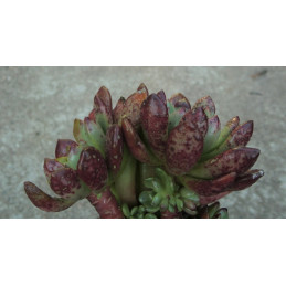 Nenáročná sukulentní rostlina. Šedě ojíněné, velmi tučné listy v růžici získávají fialový nádech na slunci. Zvonečkové, zelenobílé květy jsou uvnitř červené. Pochází z Mexika. Expedujeme rostliny: Ø květináče 6,5cm.
