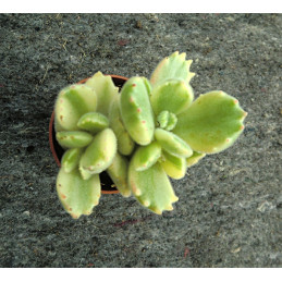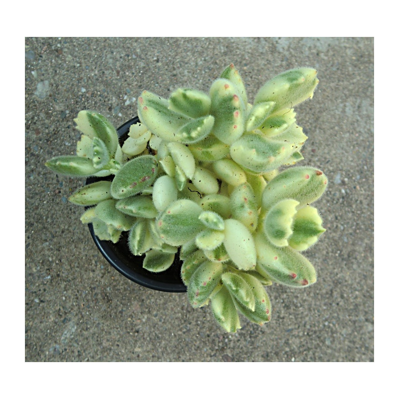 Tvoří keříčky se zploštělými a silně dužnatými listy, které jsou pokryty bílými chloupky. Zubaté výrůstky na konci listů. Krásná panašovaná forma se žlutozelenými listy. Krémově žluté- oranžové zvonkovité květy. Expedujeme rostliny: Ø květináče 5,5cm.