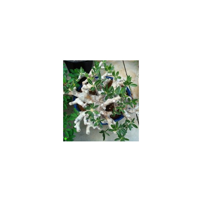 Suchomilný sukulentní keř s velmi ztlustlým kmenem. Oválné, lesklé, kožovité listy na konci výhonů. Jednoduché velké, mléčně bílé květy s růžovým okrajem a žlutým jícnem. Teplomilná rostlina vhodná na tvorbu bonsai. Expedujeme rostliny: Ø květináče 5,5cm, výška 5+cm, Ø kmínku 1+cm.