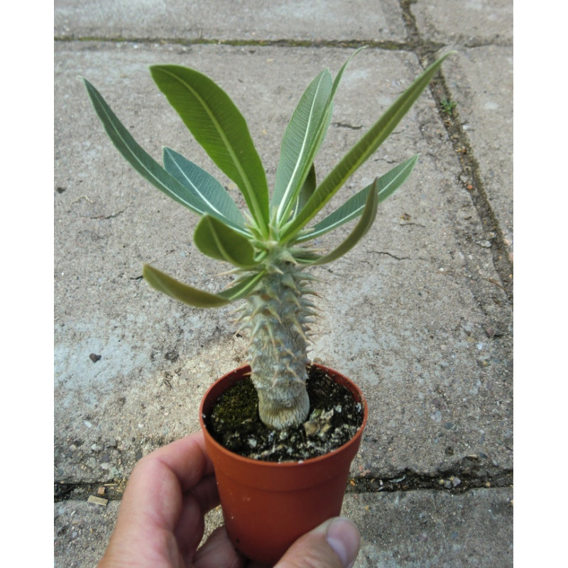 Zakrslý sukulentní keř z Madagaskaru se žlutými trubkovitými květy. Vytváří ztlustlý kmínek s ostnatými rozvětvenými výhony a oválnými leskle zelenými listy, které jsou na spodní straně stříbřité. Kaudiciformní sukulent. Expedujeme rostliny: Výška 4+cm, Ø kmínku 1+cm.